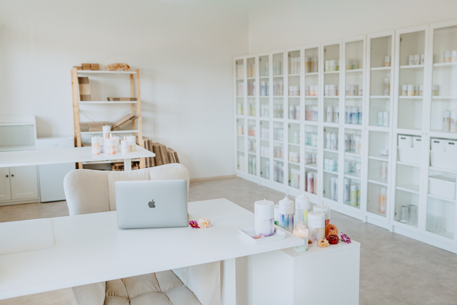 Provozovna je světlá a vzdušná, aby v sobě nesla jemnost, čistotu a andělskou energii, kterou se snažím vtisknout do každé svíčky, jež tu vzniká.